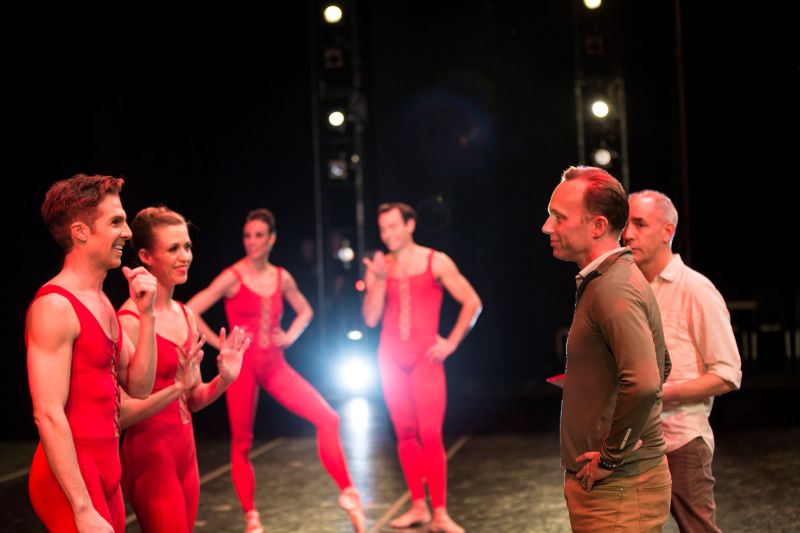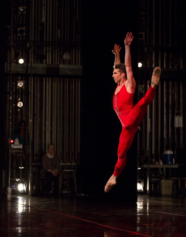 Peter Boal gives notes to Lucien Postlewaite and PNB Company dancers. Lucien Postlewaite in Ulysses Dove’s Red Angels. Photos © Angela Sterling.