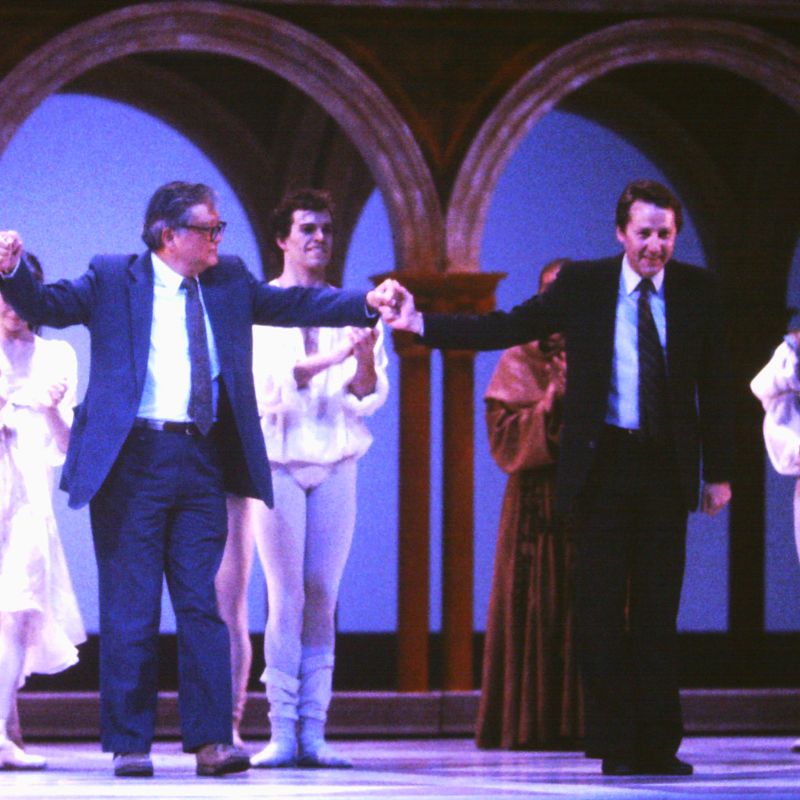 Ming Cho Lee (left) and Kent Stowell (right) take bows at the premiere of Stowell’s The Tragedy of Romeo and Juliet in 1987.