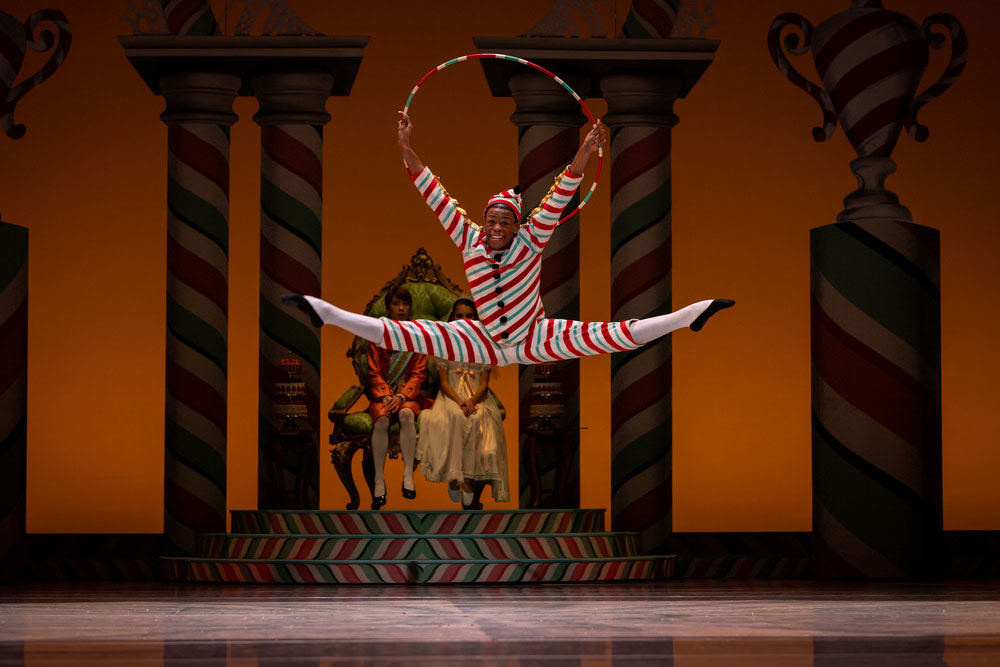Luther DeMyer as Mother Ginger; Zsilas Michael Hughes as Candy Cane; Clara and the Prince; The Nutcracker and Mouse King; Madison Rayn Abeo and Christian Poppe as Sugar Plum Fairy and Cavalier; Hare Drummer, Mouse King, and The Nutcracker; Polichinelle; Amanda Morgan as Dewdrop; Lily Wills as Coffee in George Balanchine’s The Nutcracker®, choreography by George Balanchine © The George Balanchine Trust. Photos © Lindsay Thomas and Angela Sterling.